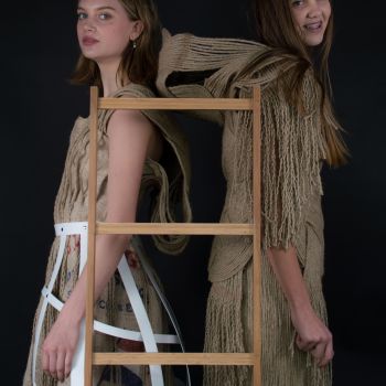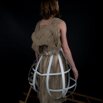 De twee creaties van henneptouw, geïnspireerd op de Zaanse industrie in de 18de eeuw gemaakt voor Zaans Hout expositie 2018. Fotografie Tabitha van Duin, model Bess van Noord en Tania Waiboer.